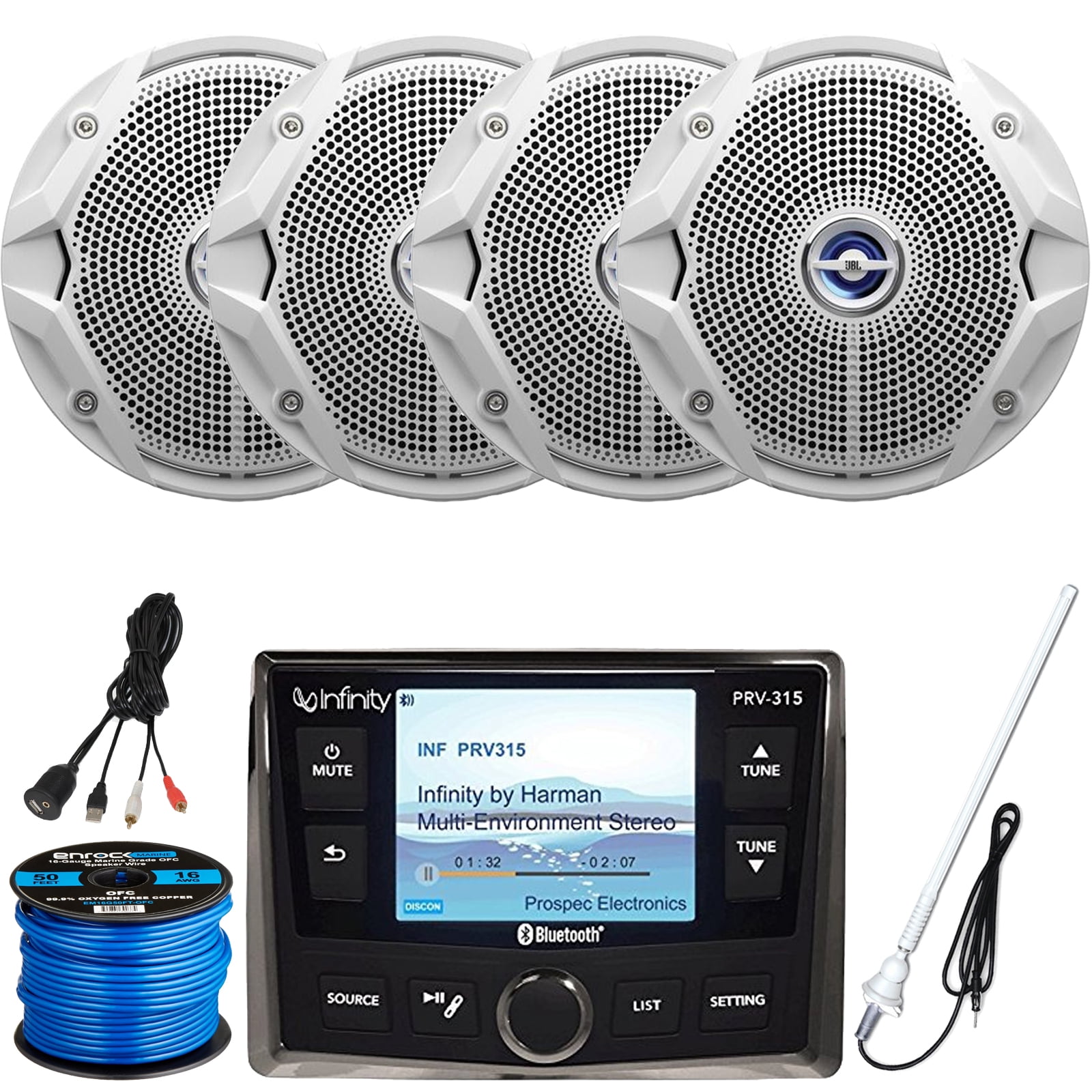 Infinity PRV-315 Marine AM/FM Bluetooth USB Full Color Display Receiver, 4 x JBL MS6520 6.5" Stereo Speakers (White, Bulk Packaging), Radio Antenna, AUX Interface, Speaker Wire - Walmart.com - Walmart.com